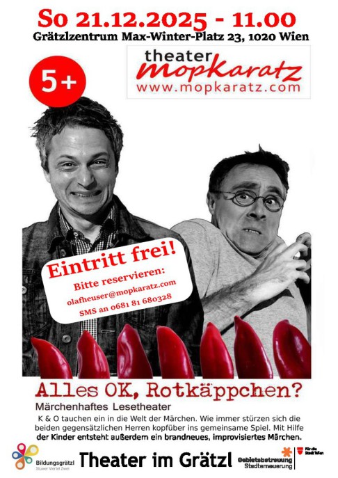Am 22. und 23.4.2025 sind dann die Klassen ins Grätzlzentrum am Max-Winterplatz 23 gekommen und haben dort als Belohnung für ihren Einsatz die Lesetheater-Performance zu Märchen 'Alles OK, Rotkäppchen?! von Theater Mopkaratz angeschaut.
